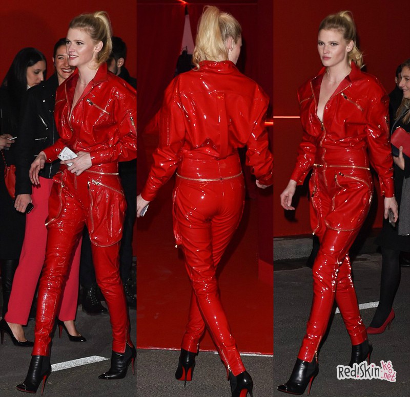 Стильно: Карли Клосс была одета в красное облегающие платье замысловатого кроя. Образ отменно дополнили туфли от Christian Louboutin.