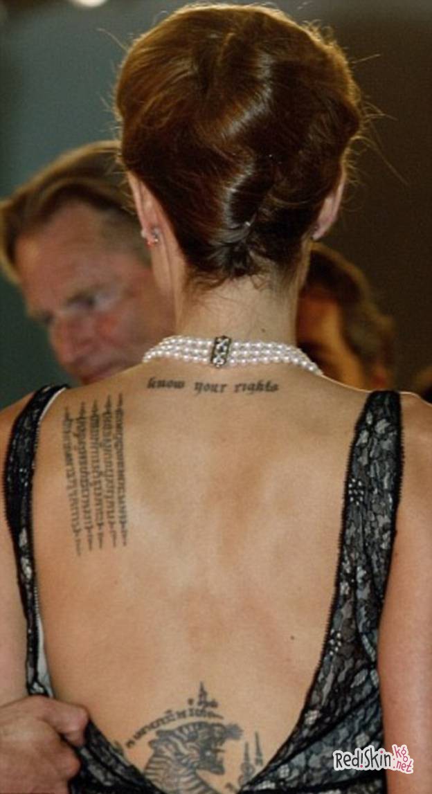 Судя по рисунку, оно сделано в стиле Сак Янт, т.е изображены священные фигуры и узоры, распространенные в странах юго-восточной Азии. Предполагается, что эта татуировка дань к тысячам погибших во время правления красных кхмеров в Камбодже. Именно об этом будет фильм, над которым она сейчас работает.