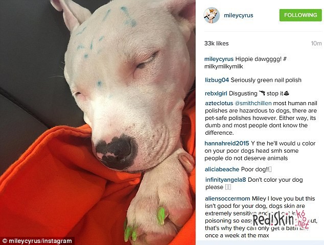 На снимках Майли можно увидеть, что животное разрисовано фломастером, а ее ногти выкрашены в зеленый цвет. "Бедный пес", "Отвратительно. Остановите это", "Майли, ты убиваешь Milkyyyyy", это лишь некоторые высказывания посетителей ее страницы инстаграм. Есть и более профессиональные комментарии. Так в одном из них сказано, что во фломастерах и лаке, которым разрисованы ногти животного, могут содержаться вредные вещества, что грозит для него болезнью и даже смертью.