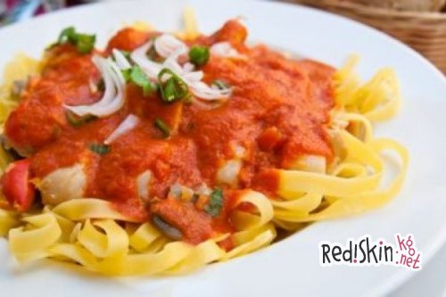 А теперь готовые макароны аккуратно разложите по тарелкам горочками и посыпьте сверху сыром. Поверх сыра столовой ложкой полейте соус. Завершающий штрих — украшение спагетти нарезанными заранее помидорами.