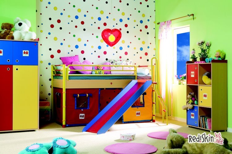 Для каждого ребенка очень важно, чтобы он имел свою комнату, свою территорию, где он мог бы сам, на свое усмотрение переставлять свои вещи, наводить порядок и проводить время, беседуя с друзьями. Такой маленький быт — первый опыт самостоятельной жизни и поэтому многие вещи и в том числе мебель, должны быть легкими, для того чтобы ребенок смог самостоятельно их поднимать и если нужно, переставлять. Лучше всего приобрести невысокие стеллажи для размещения игрушек, но высота их должна быть такой, чтобы сам легко до них дотягивался. Комнату лучше всего сделать яркой и интересной, это поможет детям лучше воспринимать окружающий их мир через эмоции или в процессе игр. А также яркие цвета всегда побуждают к активным действиям. Не забудьте, что помимо игр ребенку еще нужен хороший сон и поэтому, лучше всего комнату разделить на отдельные зоны: зона для обучения, зона для игр и зона для сна. В активной зоне стены раскрасьте яркими красками, а ту зону, которая предназначена для сна — спокойными нейтральными.