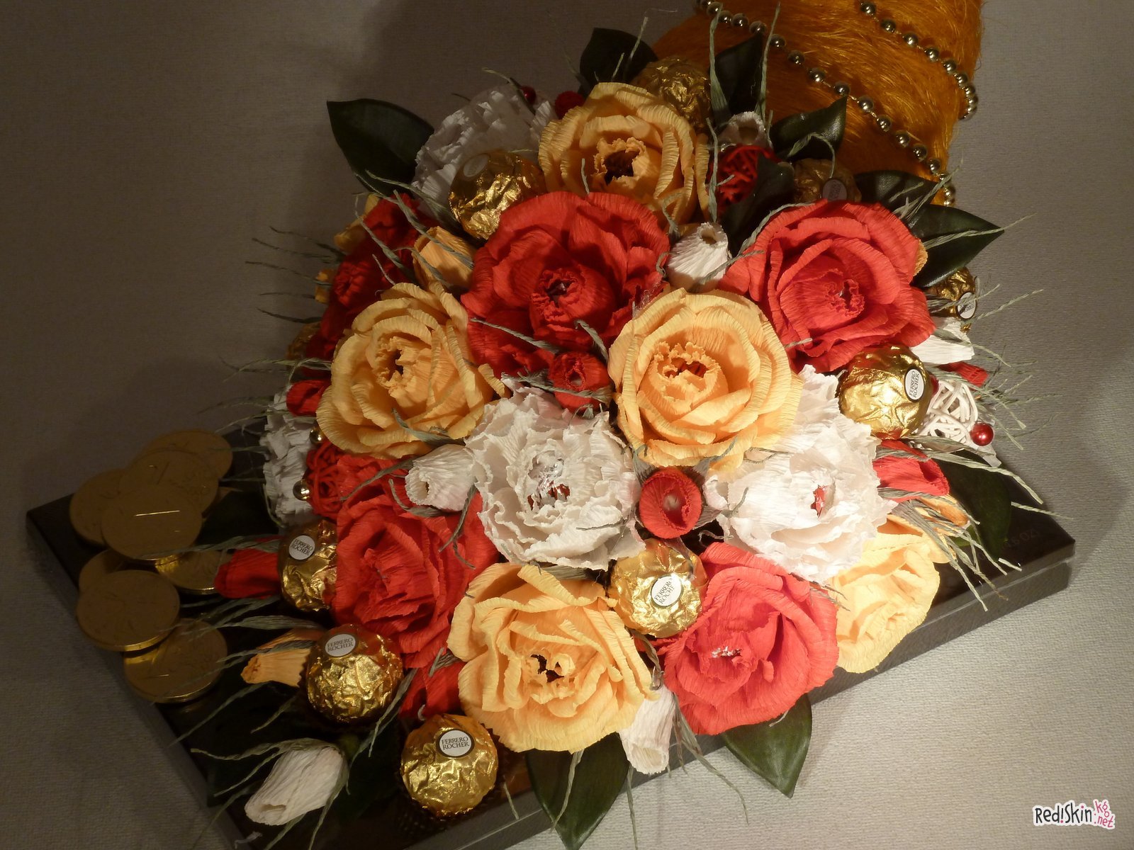 Вообще, идея изготовления конфетных букетов пришла с Запада, а затем она стала развиваться в России и Азии. Со временем это искусство еще больше усовершенствовалось. В странах Запада и Америке конфетные букеты изготавливаются из простых конфет, которые располагаются на палочках, а у нас из конфет создают шедевры, то есть целые композиции. Их формируют на разных основах — на корзинах, вазах, цветочных вазонах и т.д.