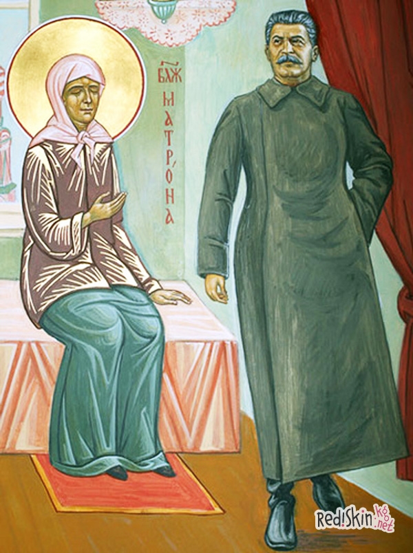 Есть икона, где блаженная Матрона будто беседует с Великим вождем всех народов – Иосифом Виссарионовичем Сталиным. Это православная икона. Существует легенда, будто Сталин был лично знаком с Матроной и часто обсуждал с ней государственные дела.