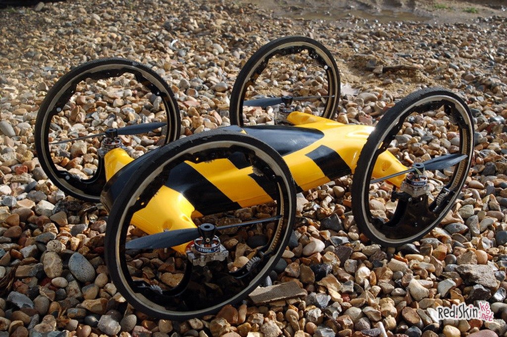 Эта уникальная радиоуправляемая модель оснащена уникальным приводом для заднихколес. При этом крепление вовсе не центрально-осевое, главный движущий элемент напрямую вступает в контакты с внутренней поверхностью круглого обода. Освободившееся центральное пространство колес позволяет размещать в них даже семидюймовые пропеллеры. И вследствие этого В может практически мгновенно переключаться от наземного на воздушный режимы передвижения.